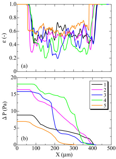 In Figure 7, the distributions of the porosity and the backpressure in the flow direction of X are shown. These describe the averaged variables in the YZ plane. The backpressure, Δp, is the pressure subtracted by the atmospheric pressure [16]. In Figure 7a, the porosity was locally varied, because the inner substrate structure was not uniform. Resultantly, in Figure 7b, the decreasing rate of the pressure was not constant. The filter backpressure was the lowest in sample 5 (cordierite), because the porosity was the highest and the filter wall thickness was thin. On the other hand, the filter backpressure of sample 4 (SiC) was the highest. At the same time, the porosity was the lowest and the average pore size was also small. By comparing the same material of samples 1 to 3, as the porosity as well as the pore size were smaller, the filter backpressure was found to be higher. Thus, the filter backpressure largely depends on the porosity and the pore size.