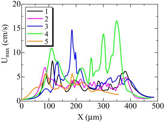 For further discussion on the filter backpressure, the filtration velocity observed in the filter wall was compared among five samples. Figure 8 shows the maximum filtration velocity measured in each YZ plane. The filtration velocity of U is expressed by