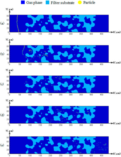 One example is described in Figure 9, showing the particle motion inside the filter. The particle positions at five different time steps are shown, where dots correspond to each particle location. These are the profiles at the central cross-section of the numerical domain at t = 4, 7, 11, 14, 21 ms. Since the filter has a three-dimensional structure, each particle could move freely into the substrate pore and never attach to the filter substrate. Even when we placed all particles at the inlet at t = 0 ms, the particle motion was transported by the convected flow, resulting in the very different motion inside the filter wall. Based on the trajectory of particles passing the filter wall, we discussed the flow path in each sample.