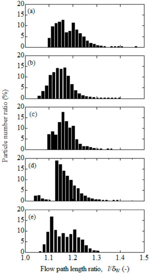 To discuss the flow field quantitatively, we estimated the flow path length, l. Here, the flow path length corresponds to the total length of the streamline calculated by the particle trajectory only inside the filter, which excludes the flow path at the region of inlet and outlet zones. Results are shown in Figure 10. Since each filter had a different filter wall thickness (δw), the flow path length was evaluated by the ratio to the filter wall thickness. We calculated the flow path length by using approximately 3600 particles. The ordinate was the value of particle numbers divided by the total particles in each range of the flow path length. Expectedly, the flow path could be longer when the particle moved along the complicated substrate structure. However, independent of the sample, the range of the flow path length was almost the same. Actually, the averaged value was 1.24, 1.20, 1.23, 1.24, and 1.23 for samples 1 to 5, respectively. That is, the flow path length was slightly longer than the wall thickness of the filter. Therefore, independent of the inner structure of the filter sample, the flow path length is almost constant.