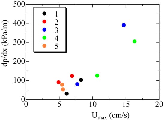 To design the filter with lower filter backpressure, the above information on the flow field must be useful. As shown in Figure 3 and Figure 4, at the region where the local space between substrates was much smaller, the local velocity was very high. That is, the flow velocity was steeply enlarged due to the narrower area along the porous wall. Then, it was difficult to go through the consecutive small pores along the filter’s porous walls, resulting in the large pressure drop. To confirm the above discussion, we examined the local pressure drop at the location where the velocity was significantly enlarged. Results are shown in Figure 11. It shows that there is a good relationship between the local pressure gradient and the maximum filtration velocity described by Equation (6). Two locations for each sample where the filtration velocity was locally the maximum were selected. To distinguish the results of each sample, color plots are used in this figure. Generally, the pressure gradient was larger when the local velocity was higher, although all plots are not on the same line. By considering each sample had different permeability, a good correlation in Figure 11 is quite an interesting finding.