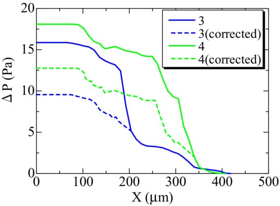 To confirm the above discussion, the filter substrate structure was modified. We selected two filters of samples 3 and 4, in which the large filter backpressure was observed. First, we specified the position with the large filtration velocity. In the case of sample 3, the small pore at which the flow was concentrated was located at around X = 200 μm. Besides, in the case of sample 4, that pore was located at X = 350 μm. These two pores could be crucial to show the bottleneck in the flow. That is, these pores showed some resistance for the net flow. Then, tentatively, two pores were enlarged to the mean pore size of 17 μm or 11 μm. The pressure distribution in the modified filter substrate is shown in Figure 12. For comparison, the original pressure distributions in Figure 7 are also shown. Apparently, the large pressure drop was avoided, resulting in the smaller filter backpressure. Therefore, if the bottleneck in the flow is more avoided, the pressure drop is significantly suppressed. Overall, the uniform pore structure is suitable to achieve the smooth velocity profile, resulting in the reduction of filter backpressure.