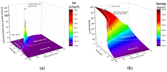Thermodynamic cycle with S-CO as a working fluid has several advantages than the conventional cycles [5] mainly due to the three following reasons. (1) S-CO has lower compression ratio provides higher compression efficiency; (2) high density of S-CO makes the turbo-machinery size extremely small; (3) the excellent heat transfer and thermodynamic properties favour for high-efficiency heat exchanger [6]. Near the critical point, supercritical carbon dioxide (S-CO) exhibits a sharp variation in thermodynamic properties. For example, the isobaric specific heat capacity attains a peak value near the critical point and decreases from that peak value in an oscillating manner along the pseudo-critical line as shown in Figure 1a. At the critical temperature and pressure, the density discontinuously raises from 300 kg/m to 600 kg/m as shown in Figure 1b. These abrupt variation in the properties near the critical point makes the convergence of numerical simulations a challenging task [7]; the simulation either diverges during initial iterations itself or not at all converges. Irrespective of better design calculations, the materials used, and other conditions, the primary factor going to affect the output of such S-CO turbo-machinery is the thermodynamic properties [8].