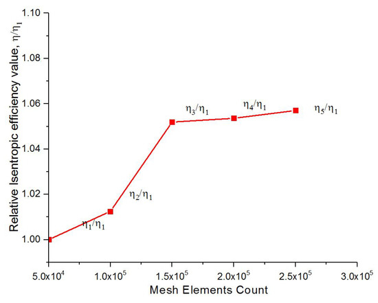 The Ansys meshing tool, turbogrid is used for grid generation because it provides customised control during grid generation of the centrifugal compressor. Near the wall surfaces such as the hub, shroud, blade and blade tip, the grid points were densely placed to ensure the y value less than 5. For impeller without tip clearance, cases with different total mesh count such as 5 × 10, 1 × 10, 1.5 × 10, 2 × 10, and 2.5 × 10 were simulated for grid independence test as shown in Figure 2. The isentropic efficiency calculated with a model consists of 2 × 10 grid cells are not change more than 0.1% than the calculated results of 2.5 × 10 case. Hence, the mesh with 2 × 10 grid cells is selected for the impeller with zero-tip clearance. Similarly, for impeller with tip clearance, with vaneless diffuser and vaned diffuser numerical models with the total mesh count of 4 × 10, 6 × 10, and 9 × 10 respectively were selected. The grid of different configurations are shown in Figure 3, and their corresponding meridional geometries are represented in inset figure.