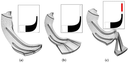 Computational domains for different centrifugal compressor configurations. Inset figures represent the meridional geometry. (a) Impeller alone. (b) Impeller with vaneless diffuser. (c) Impeller with vaned diffuser.