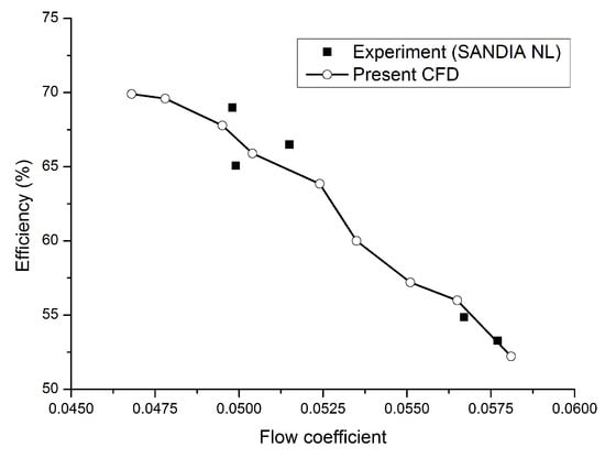 For the validation of the present numerical methodology, the simulated results were compared with the experimental results measured at SNL with an inlet temperature of 309 K and pressure of 92 × 10 Pa [15]. Figure 5 shows the comparison of the experimental isentropic efficiency and the computational results of the impeller with vaned configuration. The calculated total-static isentropic efficiency shows a good agreement with the experimental data of SNL. However, an appreciable difference is recognized at the lower flow coefficients which can be attributed to the undefined position of experimental inlet conditions in the SNL report. Since the thermodynamic state of inlet condition is closer to the pseudo-critical line, a small change in inlet temperature or pressure produces large exit properties. Figure 6 represents the results of y contour on the hub and wall surface with K- (SST) turbulence model. The y values are close to unity on blade surfaces except at the trailing edge. Even though a maximum value y of 4.3 exists on the corner of blade trailing edge, this grid point still lies in the viscous sub-layer.