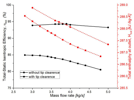 Performance characteristics of the impeller without and with tip clearance configurations for the impeller without and with tip clearance configurations are shown in Figure 7. The isentropic efficiency () defines the ratio between stagnation enthalpy (H) rise of an isentropic compression process to that of a real compression process and is expressed in Equation (4). In this equation, the subscripts “” and “” denotes the inlet and outlet section respectively while the subscript “” indicates the value when the compression takes place at constant entropy. Tip clearance reduces the value of “” as in Figure 7, and hence, its “” value is always lower than impeller with zero-tip clearance configuration. The difference between the “” values of two configurations increases from 9% at 3 kg/s to 12% at 4.75 kg/s; this indicates the increase in loss due to tip-leakage flow with the increasing mass flow rate.
