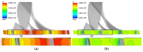 Circumferential pressure contour at the trailing edge for mass flow rate of 4 kg/s. (a) Impeller alone. (b) Impeller with vaneless.