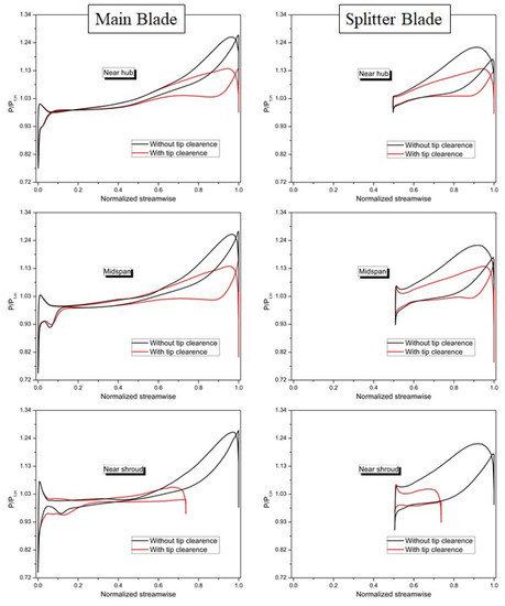Blade pressure loading for impeller without tip clearance and with tip clearance at a mass flow rate of 4 kg/s.