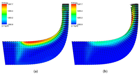 The entropy generation includes all the losses occurring in the flow passage, and the higher entropy generation denotes a lower efficiency. For the zero-tip clearance configuration, the maximum entropy generation is 1263 J/kg K as seen in Figure 10a while the maximum entropy value rises to 1267.7 J/kg K on the inclusion of tip clearance as seen in Figure 10b. Since the walls are imposed with the adiabatic boundary condition, the only source of entropy generation is flow irreversibility. In the unshrouded compressor, the shroud is stationary, and hence the low momentum flow near the shroud does not overcome the pressure gradient in the radial direction which results in a re-circulation region and a higher entropy generation. In a shrouded compressor, the shroud is rotating at same rotational speed as the blade, and the low momentum flow is absent which results in a uniform flow at the outlet. The losses in zero-tip clearance configuration are the sum of minor losses due to friction, the kinetic energy dissipation and the shear work. Therefore, the entropy generation is steady in streamwise direction without any gradient. In tip clearance configuration, in addition to these losses, the mixing loss happens due to tip clearance flow which causes the sudden increment of entropy generation.