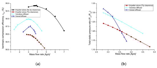 Performance characteristics of various configurations. (a) Comparison of isentropic compression efficiency of different configurations. The efficiency increases on the inclusion of the diffuser section in the impeller with the tip clearance configuration and attains a peak value near the design mass flow rate of 3.53 kg/s. (b) Comparison of the total-static pressure ratio of different configurations. The pressure ratio for vaned diffuser decreases at a higher rate than the vaneless diffuser configuration which indicates the vaned diffuser becomes less efficient at mass flow rate more than 3.25 kg/s.
