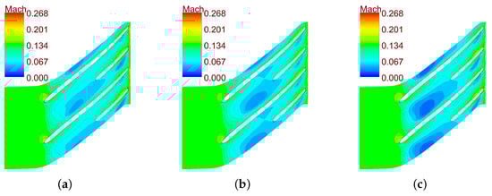 Relative Mach number contour plot at the span of 80% from hub to shroud at a mass flow rate of 3.2 kg/s. (a) Impeller alone. (b) Impeller with vaneless. (c) Impeller with vaned.