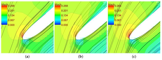 Streamlines near leading edge of the main blade on the relative Mach number contour at a mass flow rate of 3.2 kg/s. (a) Impeller alone. (b) Impeller with vaneless diffuser. (c) Impeller with vaned diffuser.