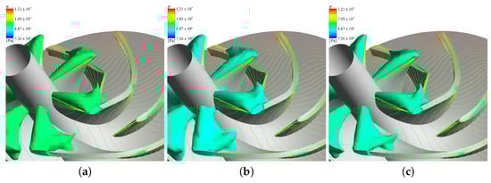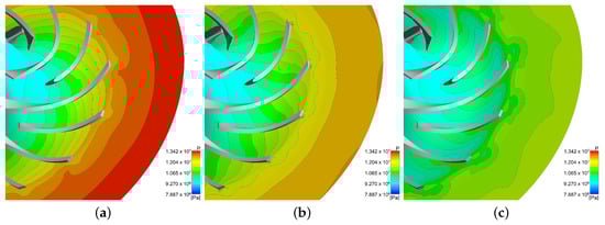 Pressure contour at span 50% span of impeller with vaneless diffuser. (a) Vaneless diffuser at mass flow rate of 1.4 kg/s. (b) Vaneless diffuser at mass flow rate of 2.9 kg/s. (c) Vaneless diffuser at mass flow rate of 4.5 kg/s