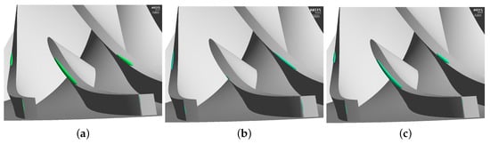 Near the leading edge, flow approaches at a higher angle of incidence which causes more acceleration on the suction side as shown in Figure 13 and due to this expansion, the Mach number increases suddenly. The high Mach number region near leading edge is relatively stronger in the vaned diffuser while the vaneless diffuser weakens. This sudden acceleration near the leading edge of the main blade causes the pressure to decrease locally, and pressure decreases lower than inlet pressure in some regions as shown in Figure 14. On operating S-CO compressor with inlet pressure closure to the critical point, pressure may drop below the critical pressure, and a phase transition may occur, the single phase flow eventually no longer existed. The tip leakage flow causes secondary flow which also induces the formation of a similar region with lower pressure the inlet condition on the blade tip in Figure 14a,c. For vaneless diffuser case in Figure 14b, it can be seen that the lower pressure region is on the tip of main blade vanishes. Further, the region with a pressure lower than inlet pressure exists even at the trailing edge of both main blade and splitter blade, thus demonstrates the severe risk of formation of two-phase flow as in Figure 15. The absence of lower pressure region on the splitter blade tip of vanless diffuser configuration shows that it reduces the risk of phase transition on operating near critical point.
