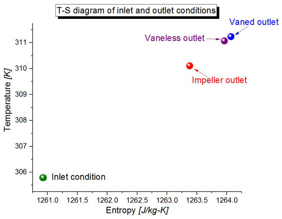 The influences of different turbo-machinery components on the temperature and entropy at the outlet in a different manner as shown in Figure 16. Even though, the entropy at the outlet of impeller alone is much lower than the two other cases; the lower efficiency in impeller alone is due to change in specific heat capacity. As in Equation (4), the isentropic compression efficiency is a function of outlet enthalpy which is a product of isobaric specific heat capacity and temperature. For a slight change in a thermodynamic state near pseudo-critical line, the specific heat capacity value changes abruptly due to real gas effect as shown in Figure 1a. This abrupt variation in the value of specific heat capacity affects the “” value which in turn affects the efficiency.