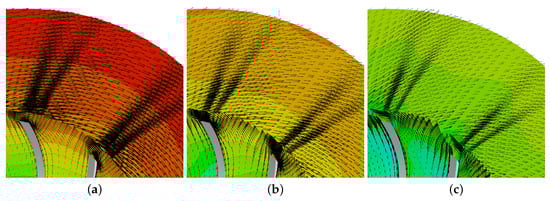 Velocity vectors near trailing edge of the main blade for vaneless configuration. (a) Vaneless diffuser at mass flow rate of 1.4 kg/s. (b) Vaneless diffuser at mass flow rate of 2.9 kg/s. (c) Vaneless diffuser at mass flow rate of 4.5 kg/s.