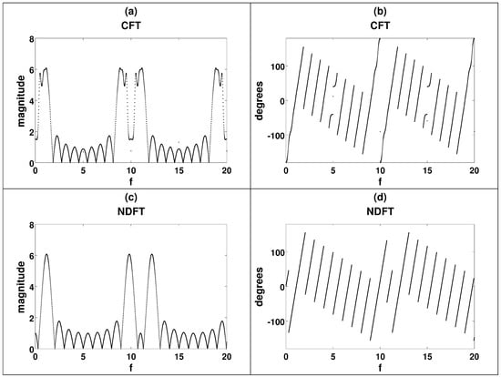 Spectral results of the function with a s = 0.1, with both the proposed CFT in magnitude (a) and phase (b), as well as NDFT in magnitude (c) and phase (d).