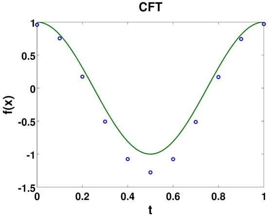 Demonstration of the function , both the original function (solid green lines), and the output (blue circles) obtained from Equation (12) and the CFT spectral results, obtained with a limited initial temporal resolution of .