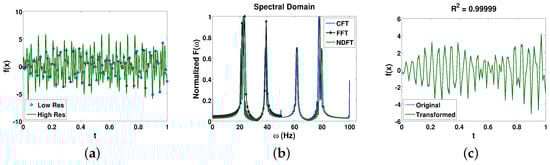 The spectral transform was taken of all six of these functions with both the CFT algorithm, as well as the NDFT algorithm defined in Equation (6). The spectral magnitude and phase from both methods are plotted in Figure 2. By using Equation (12) to get back to the temporal domain (one example is plotted in Figure 3), all six functions matched ( > 0.996) with the spectral magnitude and phase from the CFT; there is no coherent match for the NDFT. This is realized by finding the coefficient of determination between the recovered temporal data and the original temporal data; the results are tabulated in Table 2. While the NDFT may give a clear picture of the spectral domain of the function, it is impossible to recover the function back to the original temporal domain without excessively computationally intensive matrix analysis. The strength of CFT transform lies in its inverse operator defined in Equation (12), with which the true temporal function can be obtained back from the spectral domain obtained with highly resolved CFT.