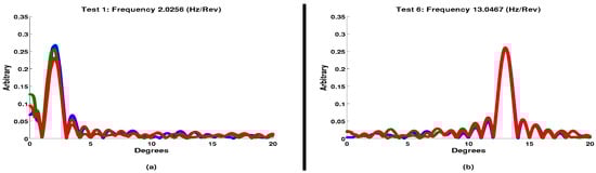 Spectral results of the randomly generated functions, for frequencies of: (a) 2.0256 (Hz/Rev); and (b) 13.0467 (Hz/Rev), but for different phases, magnitudes, and random noises.