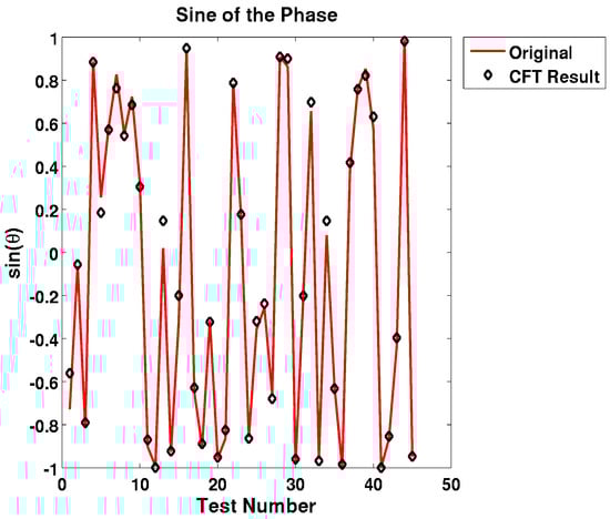 This spectral transform was remarkably effective at finding the peak primary frequency, often with accuracies down to tens of mHz. The functions of the peak frequencies (Figure 6), both of which were used for the initial function and the peak of the spectral transform, match with an value of 0.999991—effectively identical. The functions of the random phase angle at the peak frequencies (Figure 7), both of which were used for the initial function and the phase of the spectral transform at the peak frequency, match with an value of 0.9982, demonstrating that this transform can be used to capture both spectral magnitude and phase with great accuracy.