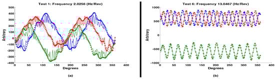 Time results of the randomly generated functions, for frequencies of: (a) 2.0256 (Hz/Rev); and (b) 13.0467 (Hz/Rev), but for different phases, magnitudes, and random noises.