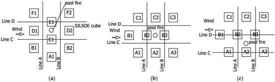 Figure 1a, the D2 cube is the Silsoe cubical building. The surface pressure of the Silsoe cube was experimentally measured with pressure taps; thus, the present numerical model was successively validated against these measurements as discussed in the next Section. Three different cubes arrangements and the smoke fire dispersion from different diesel pool fire locations were considered as shown in