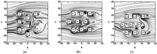 Figure 8e, the smoke was channeled along line B. Additionally, an important recirculation zone was created leeward of the C1 cube, which trapped the smoke. In this region, the smoke concentration reached its highest limits. Additionally, the smoke concentration had higher values at the