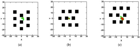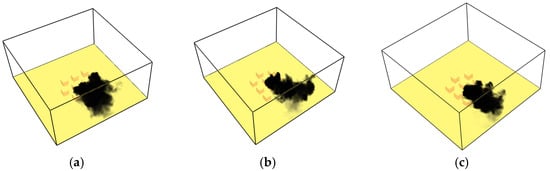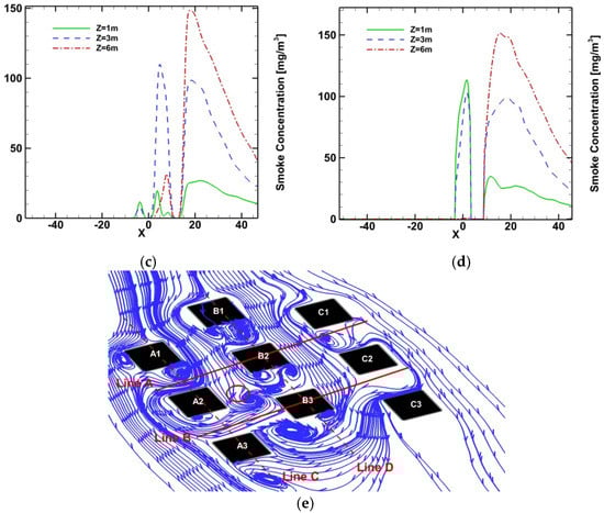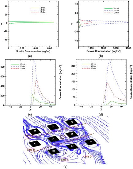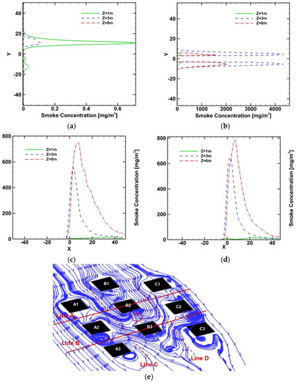Figure 10b), the smoke concentration distribution was at its maximum level at 3 m height. Along lines C and D, the smoke concentration was changing with complex variations due to complex flow phenomena caused by the cubes’ blockage. In