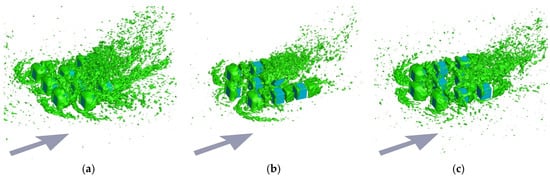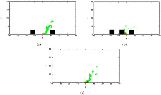 Figure 12c present the IDLH smoke zone from a fire incident that was not placed in a cube’s recirculation zone. The tilt of the IDLH smoke zone escaping the cube’s arrays height was similar for all the cases.