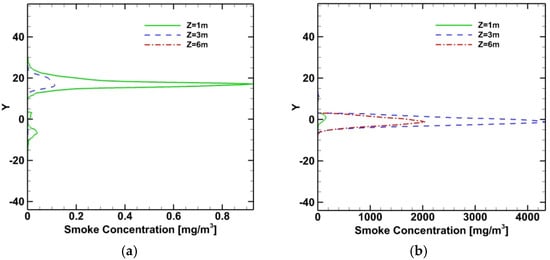 Figure 9c,d, the smoke concentration distribution was quite similar for both C and D lines. This is due to the symmetry of the flow and the pool’s fire position.