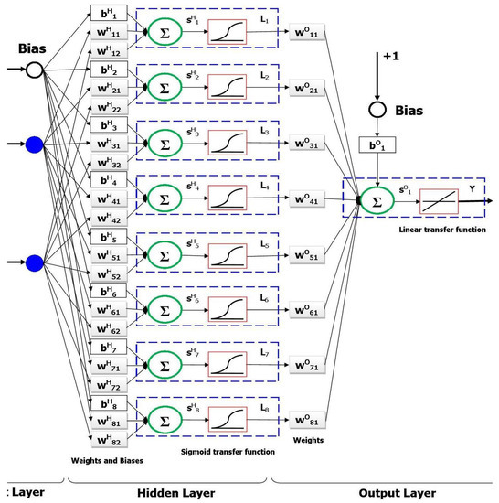 In the above equation, , j and are the input parameters vector, the index of the hidden neuron, and the interconnection weight between the input neurons with the hidden layer, respectively. In addition, is the bias of the jth hidden neuron. Afterwards, () which is the output of the hidden neurons and calculated by using a transfer function of which is related to the hidden neurons [37].