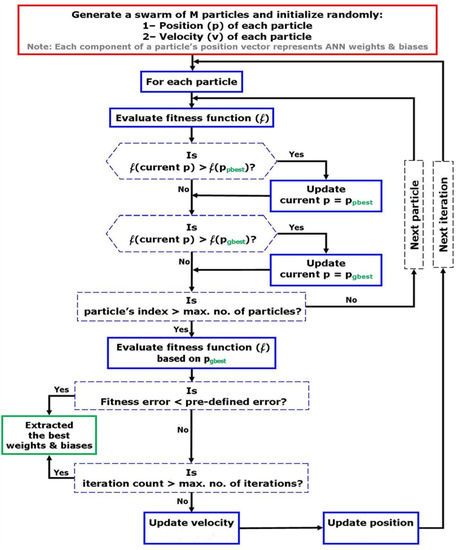 Flowchart of the Particle Swarm Optimization (PSO)-based optimization algorithm for evolving the weights and biases of the constructed artificial neural networks (ANN).