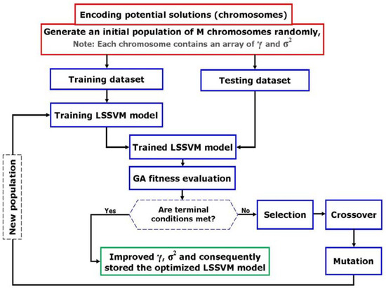 To optimize the values of the kernel (σ2) and regulation (γ) parameters in the training stage, a genetic algorithm (GA) is linked to the LSSVM model in this work. The genetic algorithm is an optimization method and is extensively utilized to solve constrained and unconstrained problems by simulating the natural selection process in biological evolution. A population of candidate solutions is moved towards the optimum solution through an iterative process in which generations are evolved based on the objective function and selection, crossover, and mutation rules. An optimal solution is obtained after successive generations. Figure 4 shows the flowchart of the hybrid GA-LSSVM model used in the current study. The procedure of utilizing this approach to optimize and is briefly described below.