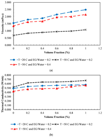 Variation of viscosity (a) and thermal conductivity (b) versus volume fraction at different temperatures.