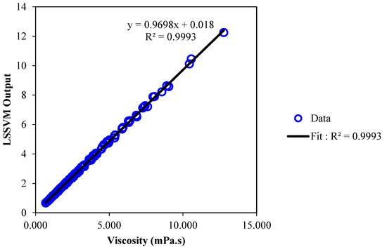 Regression plot of the proposed vector machine model versus actual viscosity of /ethlyene glycol-water nanofluid.