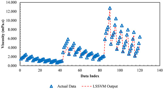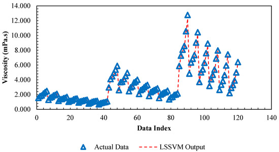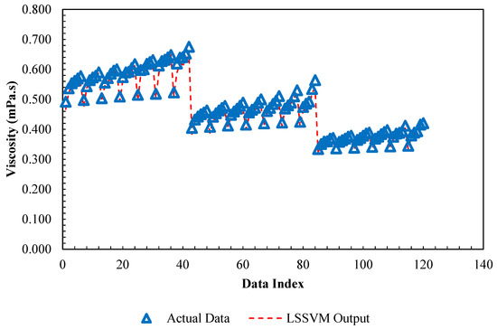 Comparison between actual viscosity of /ethylene glycol-water nanofluid and predicted values by Least Square Support Vector Machine (LSSVM) model versus relevant data index.
