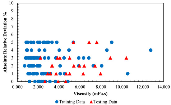 Absolute relative error distribution of the obtained outputs from LSSVM model versus corresponding viscosity of /ethylene glycol-water nanofluid data points.