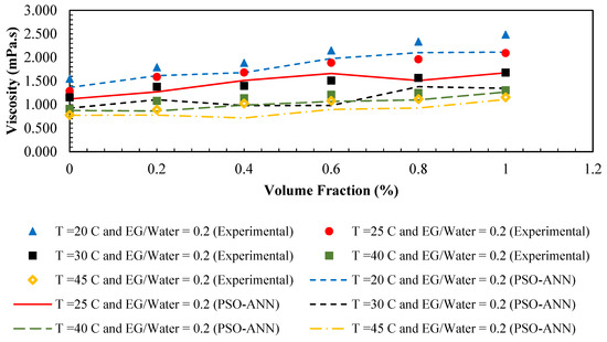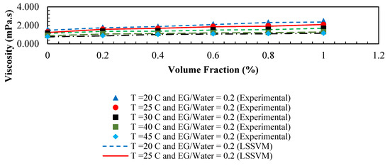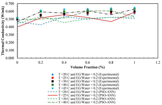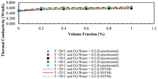 In this section, the results obtained for the viscosity and thermal conductivity of /ethylene glycol-water nanofluid using the GA-LSSVM and PSO-ANN models are presented and compared to the actual experimental values which are extracted from the references [43,44,45]. Performance of each model in predicting the thermophysical properties is evaluated using various criteria. First, to get a better insight into the general effects that concentration has on the viscosity and thermal conductivity of /ethylene glycol-water nanofluid, their variation versus the concentration are shown in Figure 5. As can be seen, for the considered range of concentration, viscosity and thermal conductivity increase by volume fraction at both temperatures of 20 °C and 50 °C, and both EG/Water ratios of 0.2 and 0.4. Moreover, for the case of EG/Water = 0.2, when the temperature increases from 20 °C to 50 °C, the viscosity of the nanofluid decreases while the thermal conductivity increases. These effects of the volume fraction on the viscosity and thermal conductivity are well discussed in the literature using experimental and numerical methods. Here, the performance of the GA-LSSVM and PSO-ANN models are investigated to evaluate how well these predictive models can follow the same trend observed in experiments for each parameter.