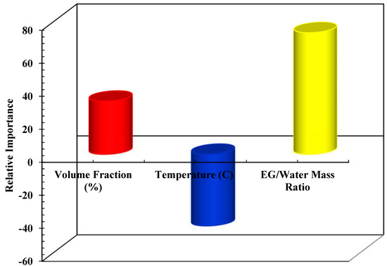 Relative importance of each input variables on the viscosity of /ethylene glycol-water nanofluid.