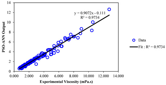 Regression plot of the proposed PSO-ANN model versus actual viscosity of /ethylene glycol-water nanofluid.