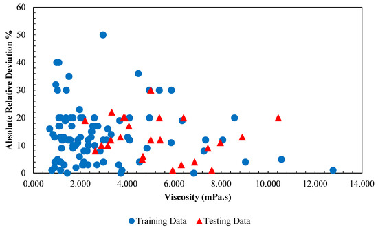 Absolute relative error distribution of the obtained outputs from PSO-ANN model versus corresponding viscosity of /ethylene glycol-water nanofluid data points.