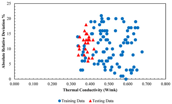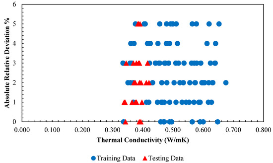Similar to the approach used in the previous sections to evaluate the performance of the models in predicting viscosity, the results for thermal conductivity are investigated in this section. The regression plot between the estimated values of the thermal conductivity of /ethylene glycol-water nanofluid obtained by the GA-LSSVModel and the actual values are illustrated in Figure 15. Sufficient accuracy is observed as the majority of the data are in the vicinity of the diagonal line. To further assess this accuracy, the major statistical criteria are represented in Table 5. Values of R2 > 0.94, AARD < 2.5, and MSE < 0.00025 are achieved for all data sets. In Figure 16, the obtained data by the model and experimental values are compared for each data index. As shown, the proposed model is accurate and reliable since the outputs of the model follow the actual data precisely. The absolute relative deviation of the model is presented in Figure 17 to get better insight into the deviation of output data versus actual data for the thermal conductivity of the nanofluid. Based on the results, as the case for viscosity, the highest relative deviation by the proposed model is approximately ±5%. Moreover, in Figure 18, model outputs and experimental data are depicted at various temperatures versus concentration. The results are matched appropriately with experimental data. In the same approach used for viscosity, to assess the relative importance of each input variable, the ANOVA technique is applied for the thermal conductivity of the nanofluid. Obtained results, as shown in Figure 19, show that the mass ratio of EG/water has the highest effect compared to other input variables.