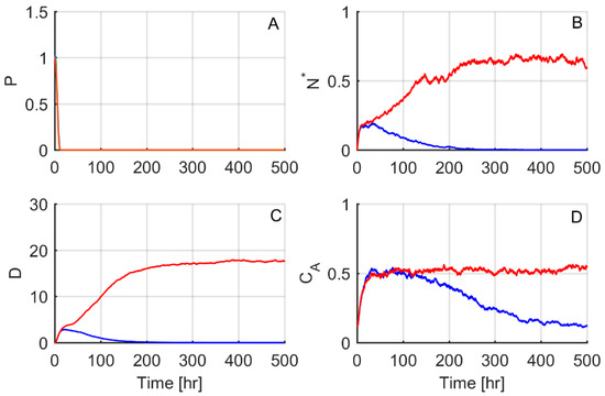 A stochastic bifurcation leads to resolving and non-resolving responses. The responses of all four model variables (A–D) are shown for two different stochastic simulations, one that resolved to the healthy steady state (blue lines) and one to the aseptic death steady state (red lines). Parameters and initial conditions were set equal to the “healthy outcome” case of [17].