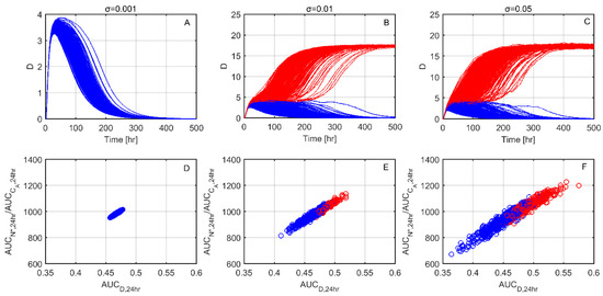 Healthy vs. aseptic death dynamics for increasing noise levels (σ). (A–C) Tissue damage (D) time responses for increasing noise levels (σ). Blue lines indicate responses that reach the healthy steady state whereas red lines indicate responses that reach the aseptic death state. (D–F) 24 h AUC of phagocytes (N*) over 24 h AUC of anti-inflammatory mediators (CA) with respect to the 24 h AUC of tissue damage (D) (AUCD). In accordance with the upper panel blue circles indicate resolving profiles and red circles non-resolving.