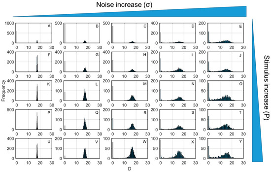 Distribution of tissue damage (D) end values at 500 h for increasing levels of noise (σ) and pathogen stimulus (P). From left to right (e.g., from A to E, F to J, K to O, P to T, U to Y) noise level increases and from top to bottom (e.g., from A to U, B to V, C to W, D to X, E to Y), stimulus level (initial condition of P) increases.