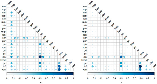 Since the preceeding analysis suggests that inflammatory outcomes are highly dependent on noise, we hypothesized that controlling noise might represent a potential method by which to regulate inflammation. In Figure 5, parametric noise control was performed and values of control strength (κ) and efficiency (e) are shown. The vast majority of model parameters did not impact noise covariance and mean level signficantly. The two parameter sets that retained the highest control strength and efficiency were the maximum production rate of the anti-inflammatory mediator (kcn) with the strength of the anti-inflammatory mediator CA (cinf), as well as the maximum production rate of the anti-inflammatory mediator (kcn) with the source of resting phagocytes (snr), as shown by the larger circles and deeper blue colors in Figure 5. The activation of resting phagocytes by previously activated phagocytes and their cytokines (knp) together with most of the rest of model parameters was also shown to impact control efficiency, but their control strength values were relatively low. Other parameter sets shown to impact control efficiency and strength were (snr,μc), (snr,cinf) and (kcn,xdn).