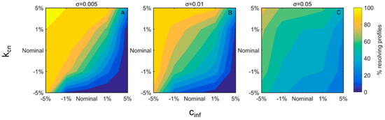Percent resolving profiles for different values of kcn and cinf at three noise levels (A–C). Parameters were varied by ±1% or ±5% of their nominal values shown in x- and y-axes. From blue to yellow the % resolving profiles are increasing. Different subplots represent different noise levels (σ).