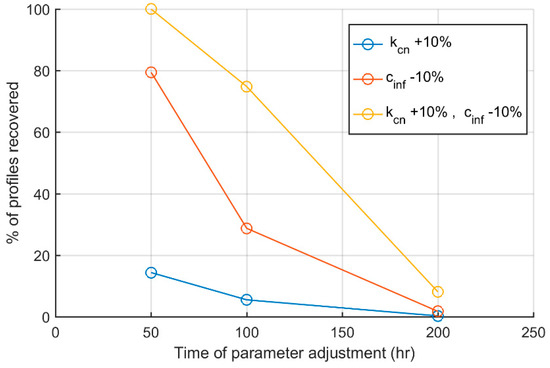 Percent of profiles recovered as a function of the time when parameter adjustment was performed. Blue line indicates kcn increase by 10%, red line indicates cinf decrease by 10% and yellow a simultaneous increase of kcn and decrease of cinf by 10% for different times during the inflammatory response.